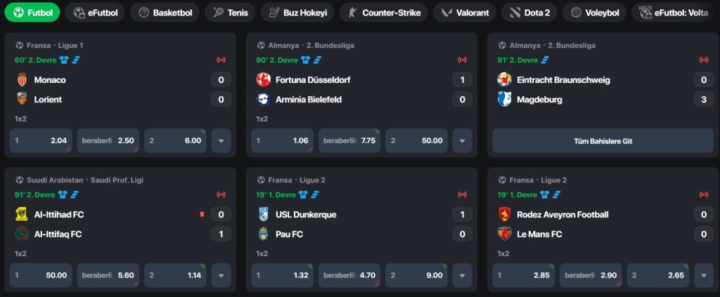 Bidaha spor bahisleri oynayanların özellikle hayran kaldığı ve bahis için çıkmak istemediği kategorilerin arasında canlı bahis bulunuyor. Mücadeleleri izlerken gidişata göre küçük dokunuşlar yapabiliyorsunuz. Örneğin favori olarak gördüğünüz takım eğer geride ise çok yüksek bir oran sayesinde çevirir oynayabiliyorsunuz. Bu sadece bahsettiğimiz basit bahis seçeneklerinden birisidir aklınıza gelebilecek kadar sayıca fazla bahis seçeneğini sistem içerisinde bulabiliyorsunuz bültenin sizlerle buluşturduğu bahis seçeneği ve oran skalası tam anlamıyla kasanızı bir anda roket gibi fırlatıyor.